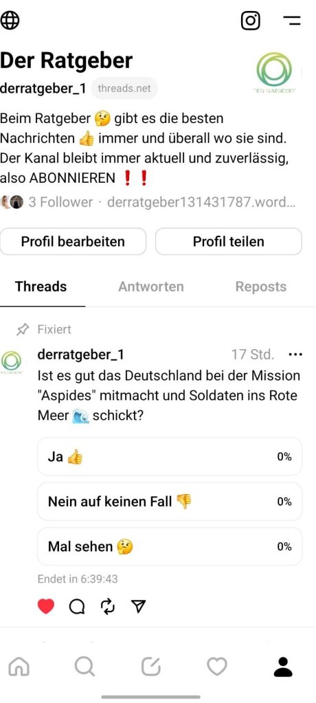 Die App Threads ist erst letztes Jahr erschienen und hatte keinen leichten Start. Trotzdem hat sie bis jetzt ĂŒber 100 Millionen Nutzer weltweit und ist Ă€hnlich wie die App X (auch bekannt als Twitter). Threads von Meta ist eng mit Instagram verknĂŒpft, und obwohl der Ratgeber nicht Instagram hat ist er nun auf Threads aktiv mit seinen eigenen Kanal. Ihr könnt gerne abonnieren und liken um den Kanal schnell voranzutreiben und mich zu unterstĂŒtzen đ