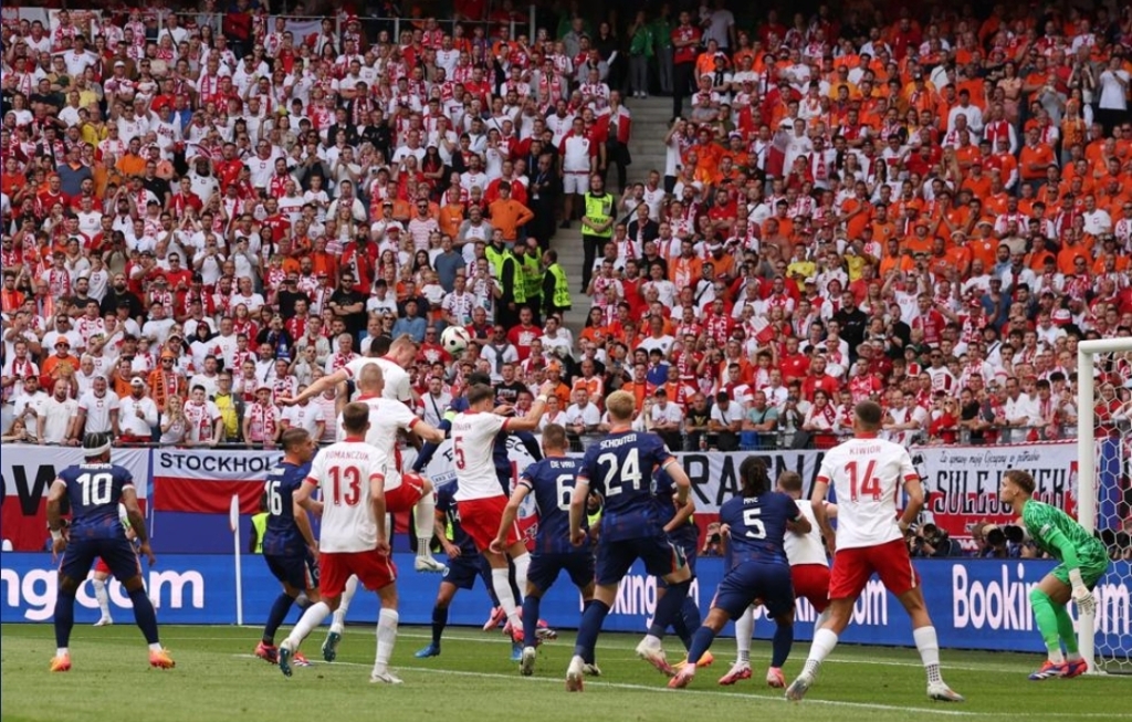 Das Team von Koeman (Niederlande) dominiert seit dem Anfang des Spiels, sie spielen einen kreativen und schnellen Fußball ⚽️. Polen hingegen stellt sich hinten rein und verteidigt recht gut, außerdem kommen sie mit dem körperlichen Spiel der Niederlande klar. Gleich am Anfang kommt Gakpo (Niederlande) zu einem Schuss auf's Tor. In der 16. Minute bekommt Polen einen Eckball, davor konnten sie keine knappen offensiven Aktionen zeigen. Der Eckball wird von Zieliński ausgeführt, und Buksa nickt ein, Tor für die Niederlande! Aus dem Nichts die Führung, nicht wirklich verdient aber der Eckball ist super ausgeführt.