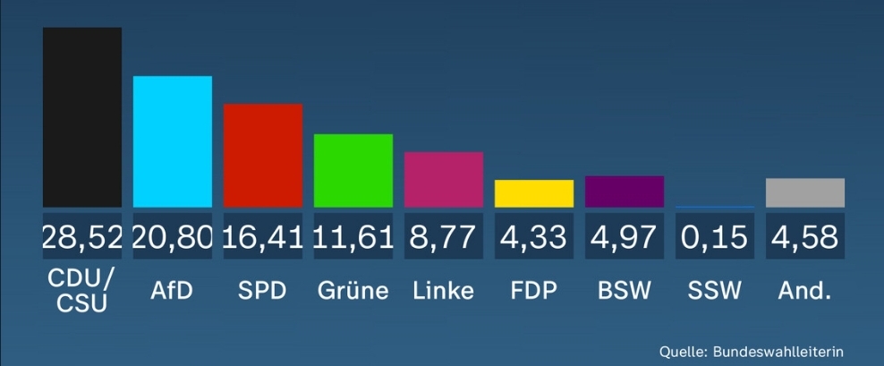 Die FDP (4,33%) und das BSW (4,97%) scheitern beide an der 5%-Hürde, wobei das BSW den Einzug in den Bundestag deutlich knapper verpasst. Die anderen Parteien kommen insgesamt auf 4,58%.