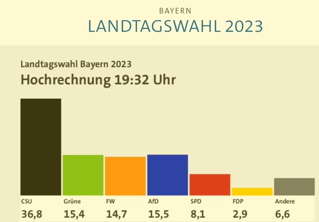 Bei den Landtagswahlen in Bayern siegt die CSU, trotzdem ein historisch gesehen erniedrigendes Ergebnis (36,8). Hinter der Partei von Markus Söder folgten die Grünen und die AFD die sich ein knappes Rennen ablieferten. Die FDP enttäuscht und die SPD macht sich sich nicht bemerkbar. Die Freien Wähler profilieren sich mit 14,7 Prozent, ein Rekordergebnis für die Partei von Hubert Aiwanger.