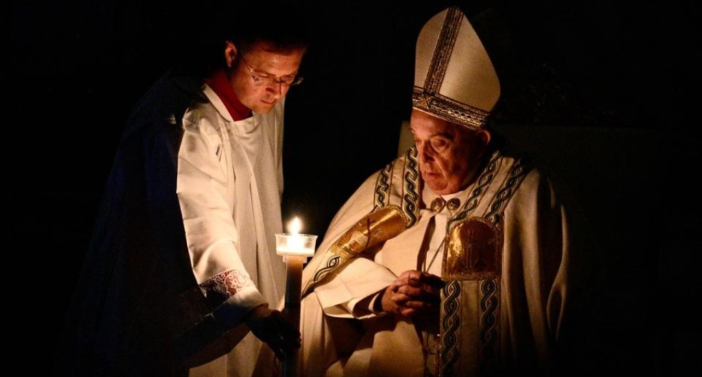 Christen feiern in der Nacht 🌃 vor Ostersonntag die Auferstehung Jesus nach seiner Kreuzigung. In einer Prozession wurde die Osterkerze in voller Dunkelheit durch den Peterdom getragen, um das Leben ohne Glauben zu symbolisieren Anschließend wird die Kerze nach dem Ruf "Lumen Christi" (Licht Christi) angezündet. Im Rahmen der Feier taufte er 8 Erwachsene, insgesamt vier Italiener, zwei Südkoreaner, einen Japaner sowie eine Frau aus Albanien. Der 8️⃣7️⃣-jährige absolvierte die Feier im Sitzen, am Karfreitag hatte er auf die Teilnahme am Kreuzweg verzichtet.