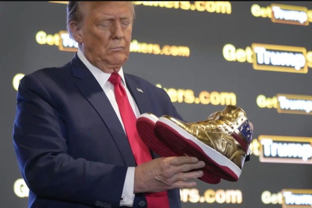 Der frĂŒhere US-PrĂ€sident Donald Trump hat bei der SneakerCon in Philadelphia seine eigene Sneaker-Marke vorgestellt, goldene High-Tops mit einer amerikanischen Flagge hinten drauf, "die ersten offiziellen Trump-Schuhe". Auf einer neuen Website werden die "Never Surrender High-Tops" fĂŒr 3ïžâŁ9ïžâŁ9ïžâŁ US-Dollar angeboten, gemeinsam mit anderen Schuhen đ der Marke Trump, das Eau de Cologne und das ParfĂŒm "Victory 47" fĂŒr 99 Dollar.